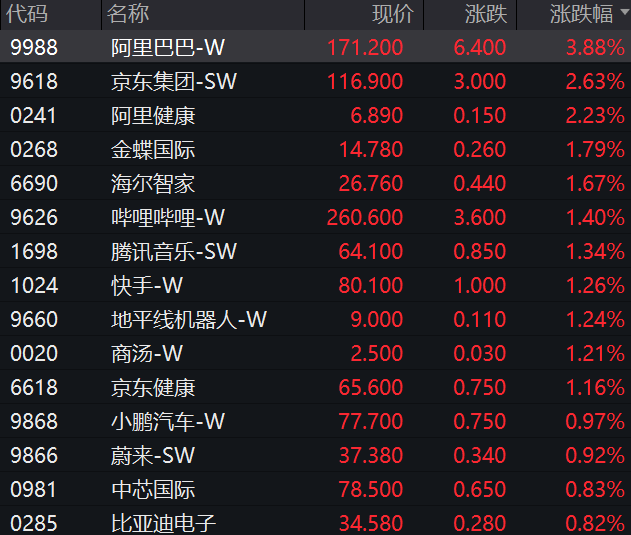 京东集团、阿里健康涨逾2%,腾讯音乐、哔哩哔哩、快手、商汤涨逾1%。
