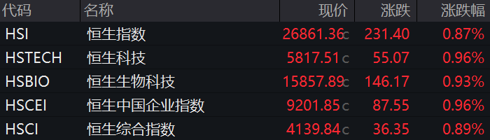 1月23日,香港恒生指数开盘涨0.87%,恒生科技指数涨0.96%。