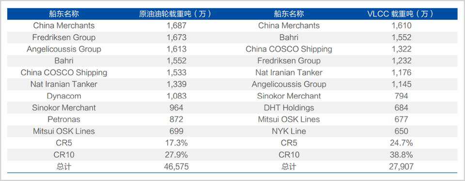 据克拉克森最新数据,按VLCC载重吨计算,招商轮船、中远海能分别以1610万吨和1322万吨位列全球第一、第三,前十家公司市场占有率合计已接近40%。