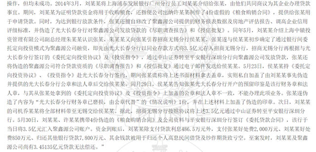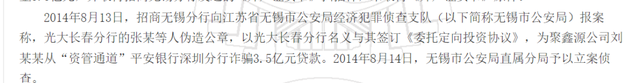 2014年8月13日,招商无锡分行向无锡市公安局报案称,光大长春分行的张某等人伪造公章,以光大长春分行名义与其签订《委托定向投资协议》,为聚鑫源米业刘某某从“资管通道”平安银行深圳分行诈骗3.5亿元贷款;第二日,案件被立案侦查。