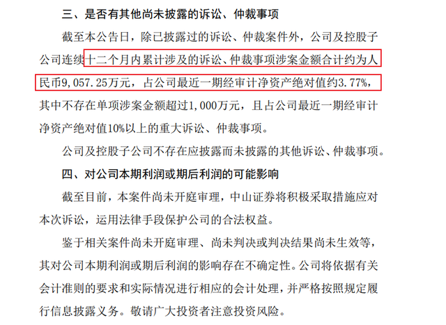 锦龙股份同时披露,剔除上述重大诉讼后,中山证券在过去12个月内累计涉及的诉讼、仲裁事项涉案金额约为9057.25万元,占锦龙股份最近一期经审计净资产绝对值的3.77%。
