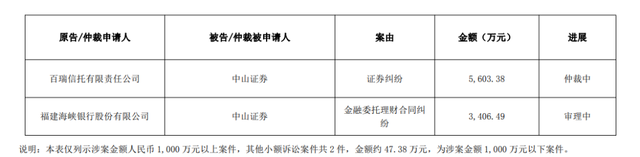 其中,中山证券作为被告,还与百瑞信托、福建海峡银行存在纠纷,案由分别为证券纠纷和金融委托理财合同纠纷,涉诉金额分别为5603.38万元、3406.49万元,目前,两起案件均未作出裁定。