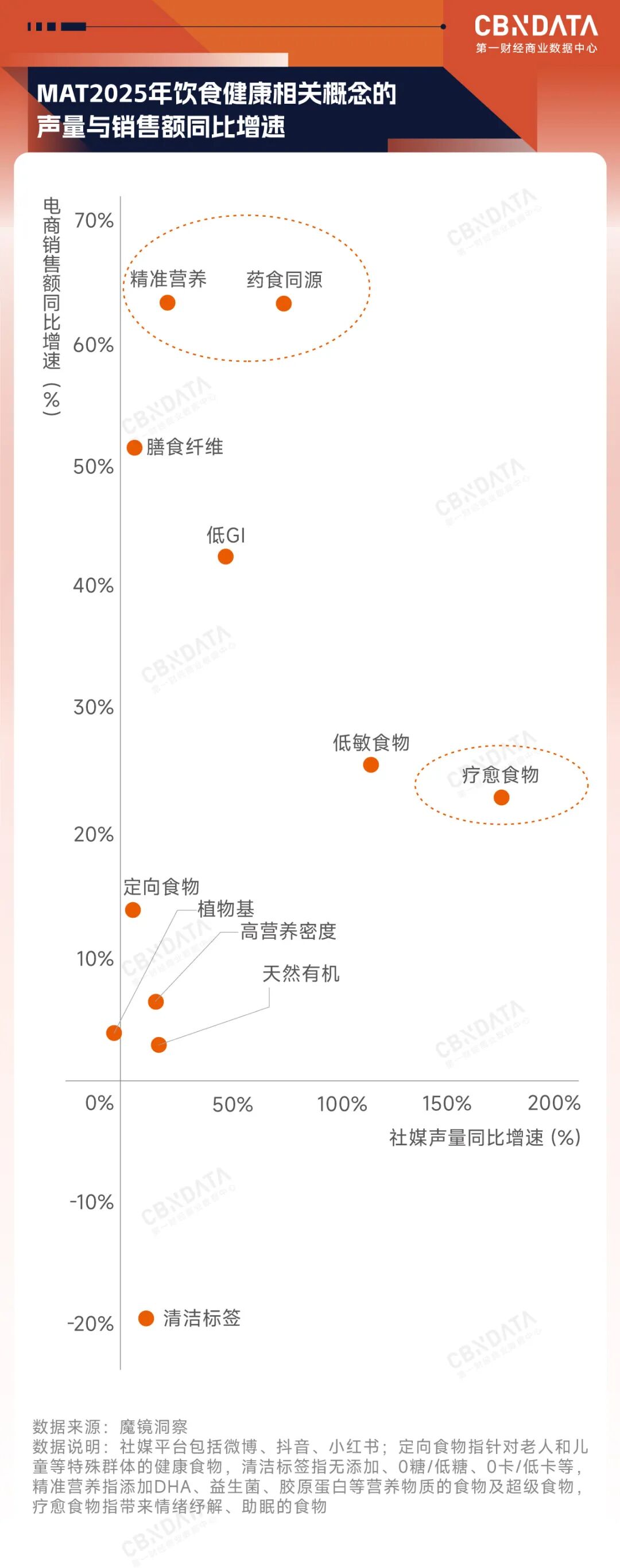 健康饮食方面,“药食同源”和“精准营养”是其核心驱动,“疗愈食物”则成为新兴引擎,朝着场景化与精准化纵深发展。药食同源产品借助AI与生物技术实现成分纯化与场景定制,精准营养聚焦益生菌等成分配方解决具体健康痛点,疗愈食物则通过功能性成分与风味设计满足情绪需求。