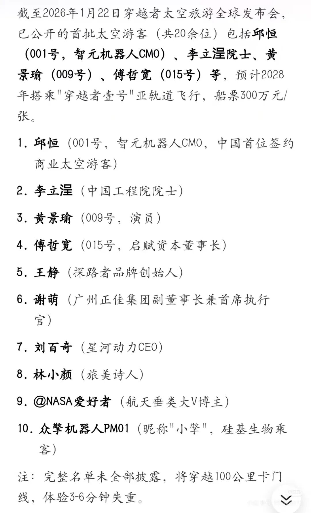 据穿越者此前消息,穿越者已开启船票预售,预售船票300万/张,预付10%可锁定名额,目前已签约来自学界、商界、航天界、艺术界、娱乐界、网红界等领域的十余位付费太空游客。会上,首批太空游客亮相,包括中国工程院院士李立浧、智元机器人CMO邱恒、探路者品牌创始人王静、啟赋资本董事长傅哲宽、演员黄景瑜等,此外,首批太空游客还包括一名硅基生物,为众擎机器人PM01。