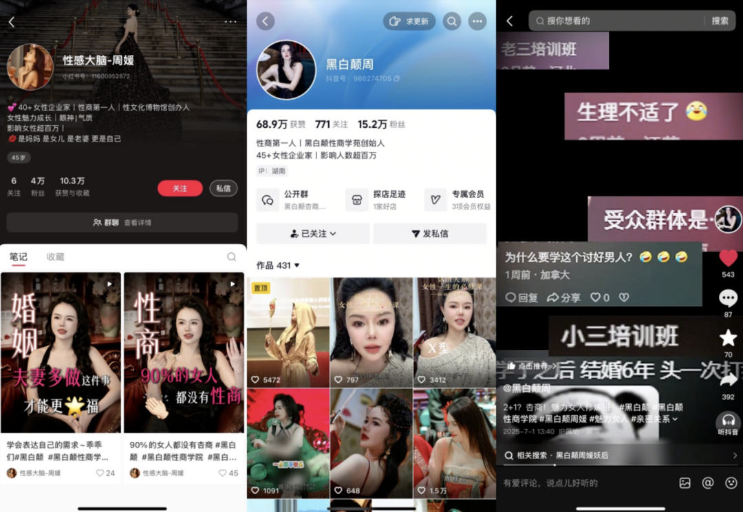 据此前报道,近期周媛因开办魅力女性修炼班、教人如何用眼神勾人等陷入争议,相关账号发布的视频中,部分画面尺度较大,被网友质疑发布低俗擦边内容。而藏在“性商教育”大旗背后的,可能是一门日进斗金的生意。据悉,其官方商城付费课程收入已超2400万元,累计学员或达数万人。