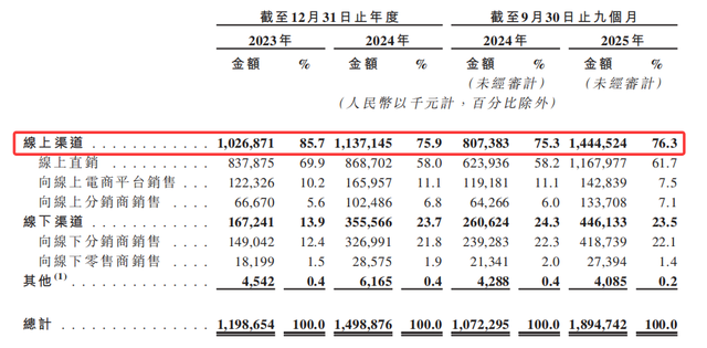 渠道上,半亩花田积极布局小红书、抖音等电商平台,2023年至2025年9月30日止九个月,公司来自线上渠道的销售收入分别为10.27亿元、11.37亿元、14.45亿元,占同期总收入的比例分别为85.7%、75.9%、76.3%。