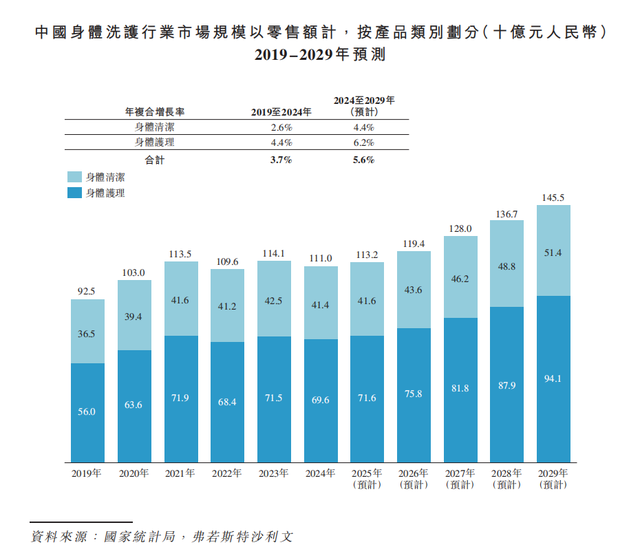 近年来,中国个人护理赛道增长迅猛。根据弗若斯特沙利文数据,2024年中国身体洗护市场规模达1110亿元,预计2024-2029年复合增长率为5.6%,2029年有望达1455亿元。