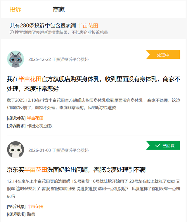 截至发稿,黑猫投诉平台已有280条涉及“半亩花田”的投诉,主要反映产品使用后出现不良反应,且商家客服回应不及时、解决方案未达预期。在研发投入不足的情况下,如何构建坚实的产品护城河,成为亟待解决的问题。