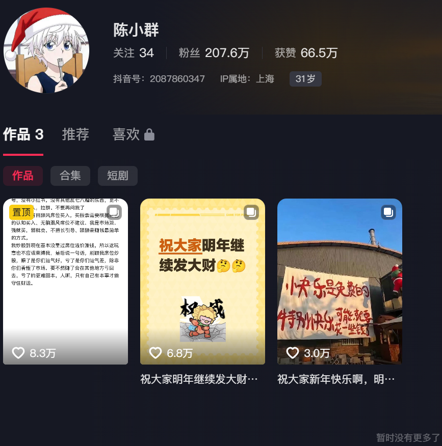 风波发生后,一个实名认证为“陈晏群”、拥有超200万粉丝的抖音账号几乎清空内容,仅保留三条旧文。