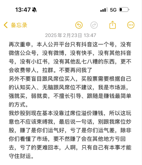 其置顶图片中,一则写于2025年2月的备忘录尤为醒目,其中写道:“别跟我席位炒股,赚了是你们运气好,亏了是你们运气差。”