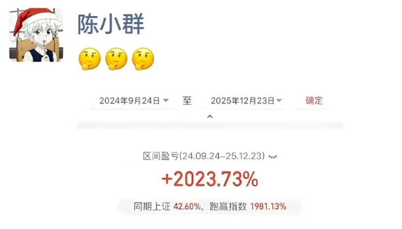 这句话,似乎真的有实锤。到了12月23日,“陈小群”在朋友圈晒出924行情以来收益。