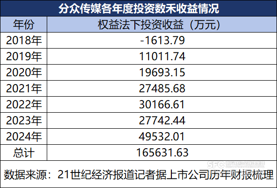 在数禾成为联营公司后,分众传媒以权益法计算数禾的投资收益。记者根据上市公司历年年度报告梳理了分众传媒各年度权益法下对数禾计提的投资收益情况,2018年至2024年7年间,账面投资价值累计增超16亿元。此外,从最新公告数据来看,2025年前三季度数禾净利润约7.85亿元,四季度净亏损6.84亿元,这意味着2025年分众传媒仍可获得约5000万元投资收益。