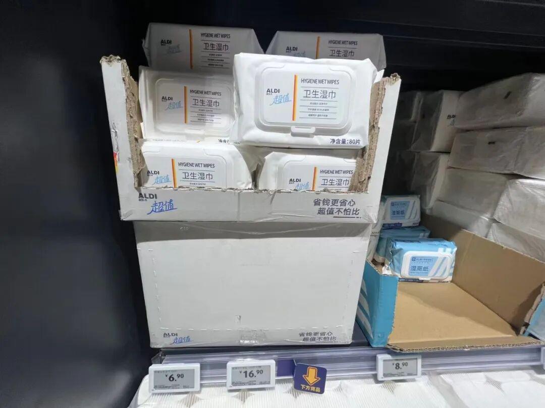 在百货商品层面,奥乐齐的选品也更细腻,以湿巾为例,这个东西,很多消费者日常是把它当一次性抹布用,用在厨房,或者餐桌等,但奥乐齐湿巾的单片装看起来对中国小家庭的使用场景与习惯有研究,单片尺寸及克重比较契合中国小家庭使用。国内一些超市做的自有品牌湿巾,整包的重量跟奥乐齐是一样的,但湿巾片数更少,单片湿巾则又大又粗,中国小家庭使用起来总觉得浪费。
