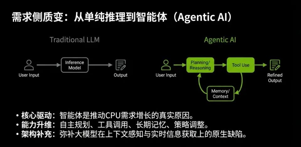 现在AI就处在这个阶段,模型够大、GPU够用,但AI Agent百家争鸣,需要多任务处理,CPU需求就爆棚了。
