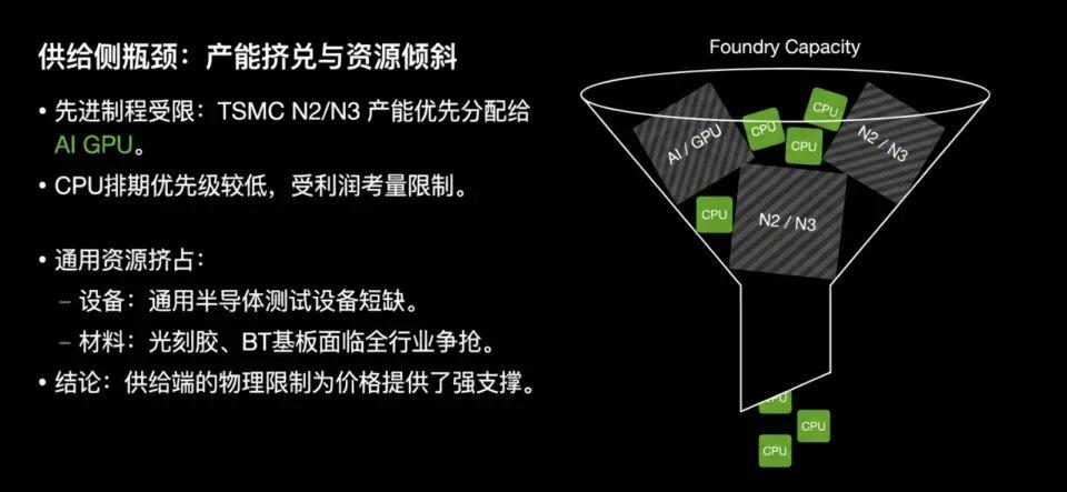 此外,制造CPU所需的配套ABF载板、Low-CT玻璃布等关键材料,其产能同样被AI GPU严重挤占,形成材料级的“卡脖子”。