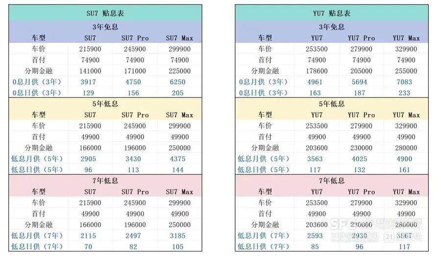 “7年超低息,轻松入手特斯拉”“小鹏全系享7年低息,月供低至1355元”“购小米YU7 7年低息”……