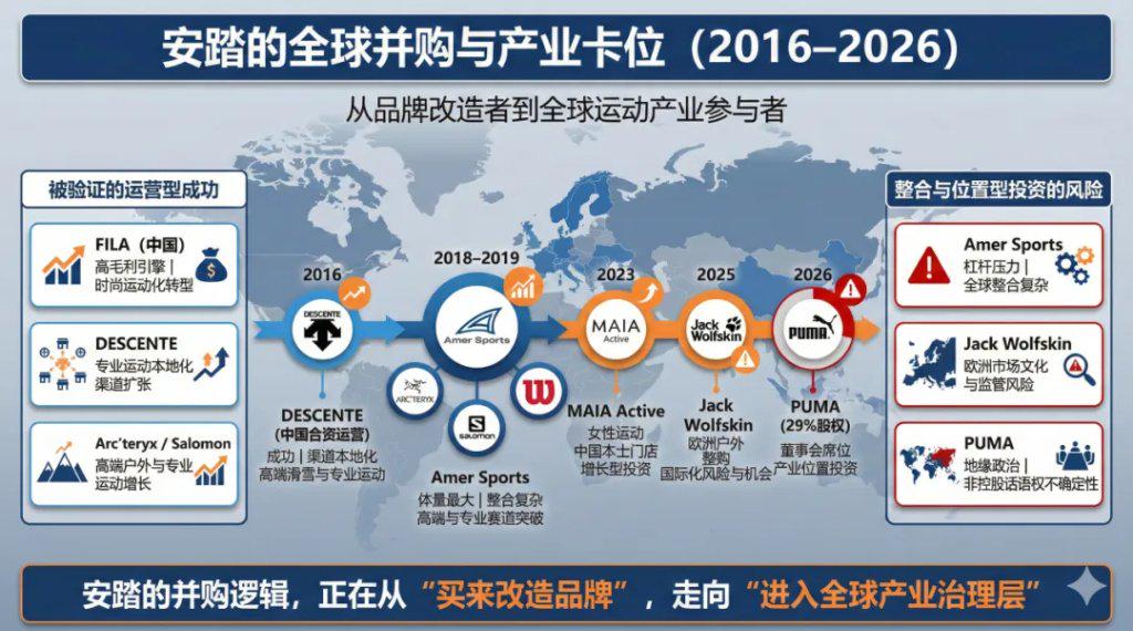 这与亚玛芬、狼爪并购时代形成了鲜明的反差,使安踏并购模式从以往“买来改造品牌”的整合,转向以资本为纽带、进入全球产业治理层的战略协作。