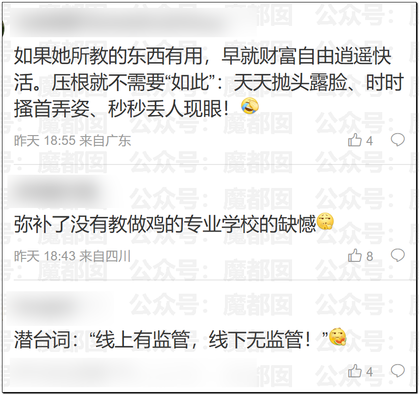最后说个标题上的事情,很多粉丝在问,我们看了一下,是真的难写,不是写不出,是尺度实在太大,我们一开始以为是那种类似“情感课程”之类的骗局,骗很多人来提升所谓的情商之类的,结果看了她的一些课程之后发现完全不是!