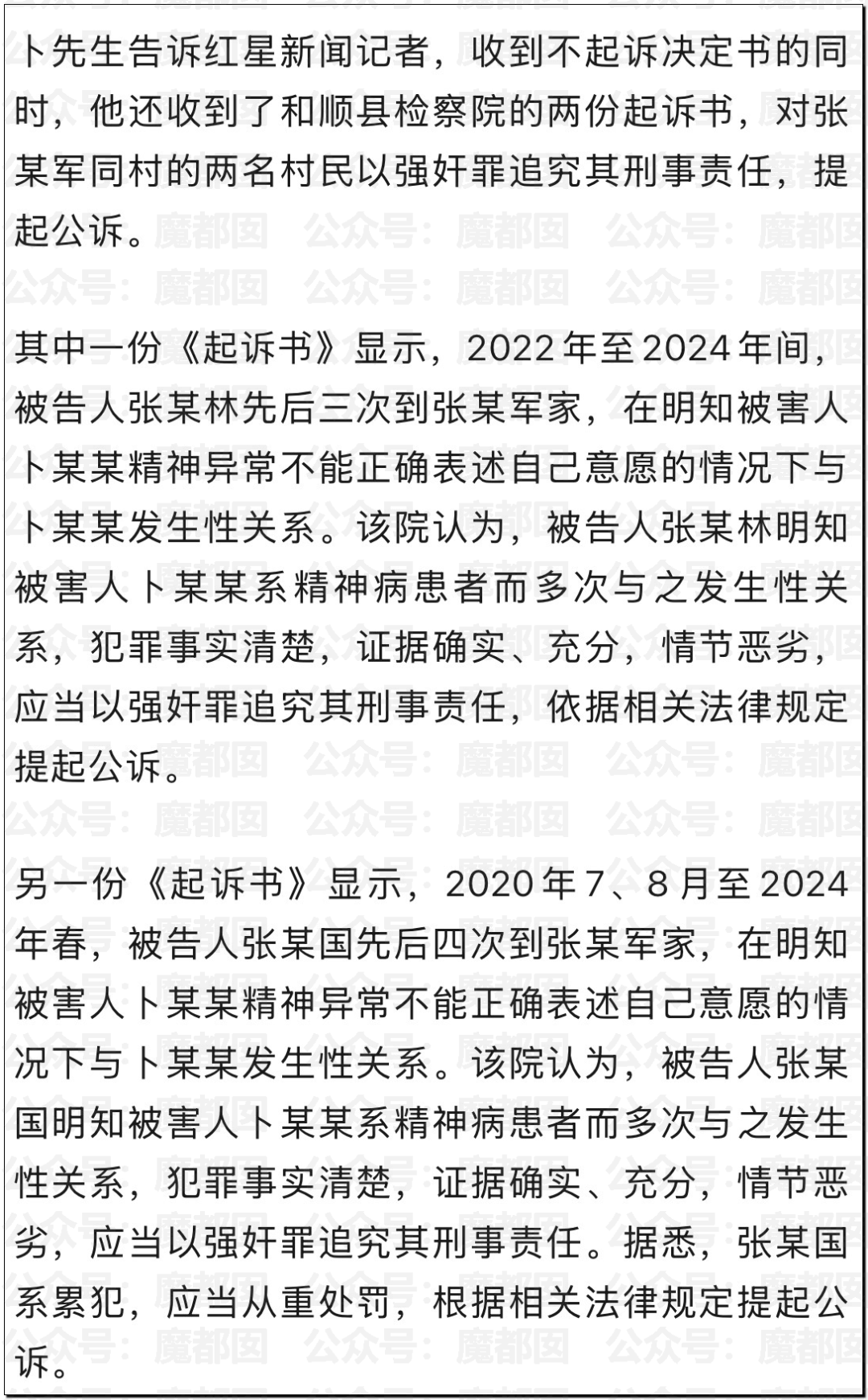 同村的张某明和张某国两人都多次QJ过卜女士,“证据确实、充分,情节恶劣”。卜女士的家人们为她付出了很大的努力,她的病情也有所好转“不再大小便失禁”。