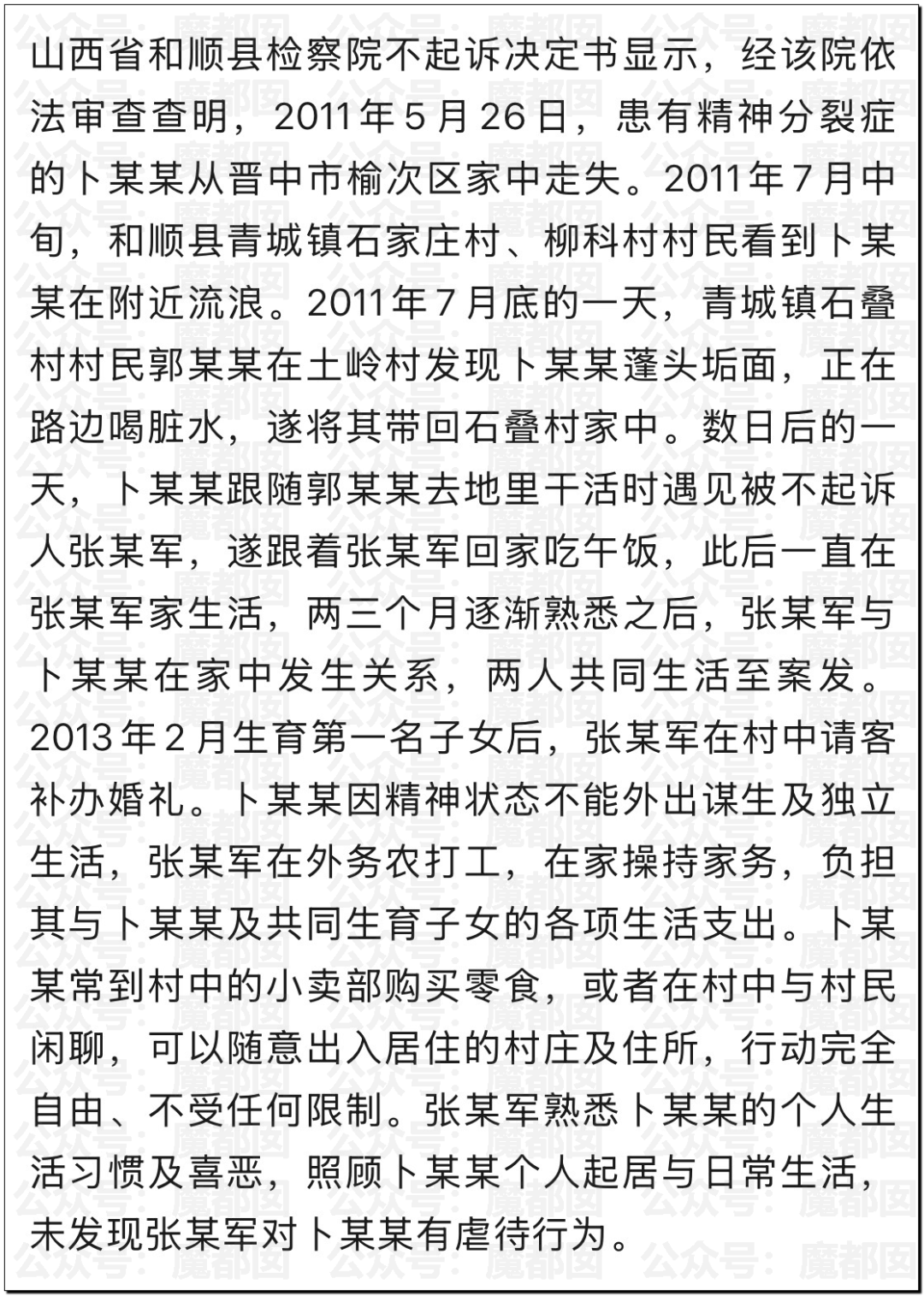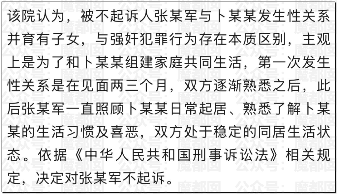 不起诉“丈夫”张某军,因为不是“QJ”是收留照顾两三个月稳定同居后,才和不具备性自我防卫能力的精神分裂患者组建家庭生育子女的,并且生育首个子女后补办了“婚礼”。