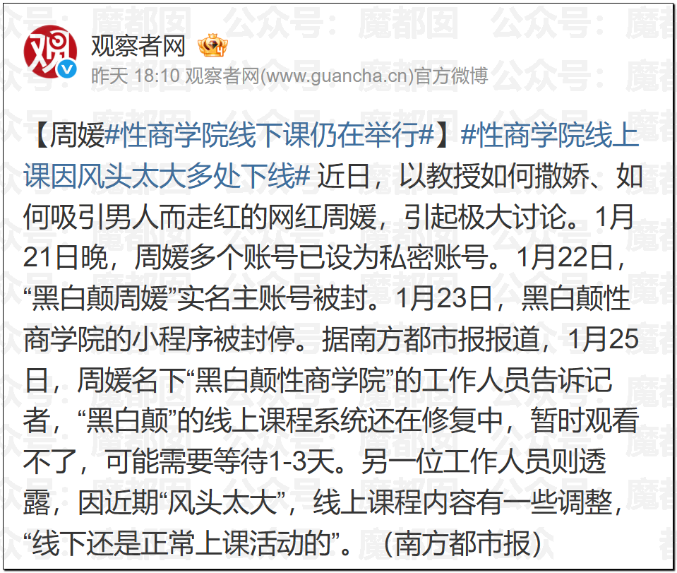 像“性商教母”周媛这样的人物,我们平时根本刷不到,或者说她们搞的这玩意,已经远超一个普通钢铁直男的想象力了,自然不会有什么交集。所以每次,我们都只能在看到封号新闻之后,才会知道世上有这么一号人。