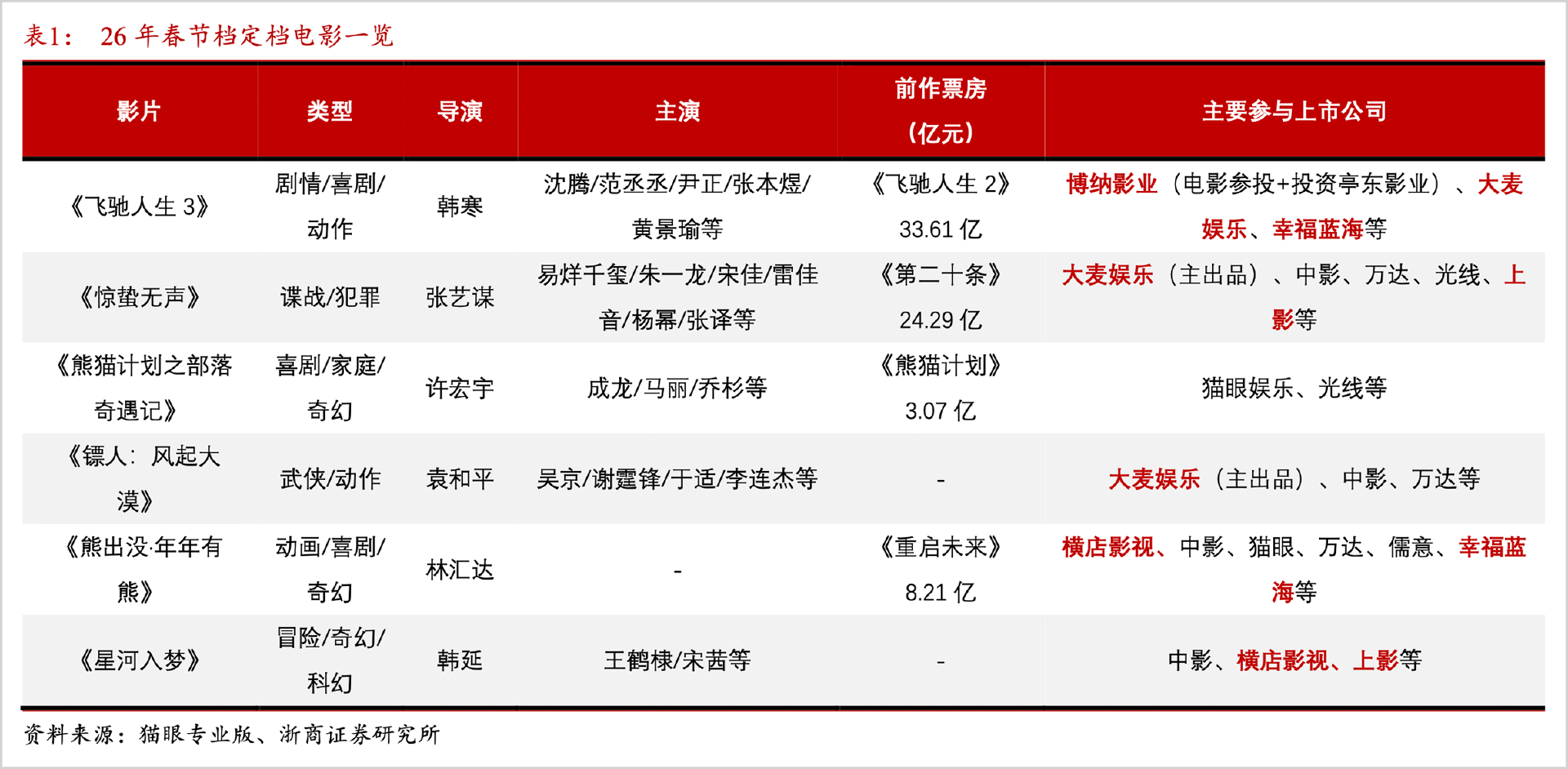 而且该系列前两部评分也呈走高之势,浙商证券预测其档期票房在25-30亿之间,若不出意外,将成为今年春节档冠军,背后的博纳影业、大麦娱乐、幸福蓝海、横店影视等将受益。