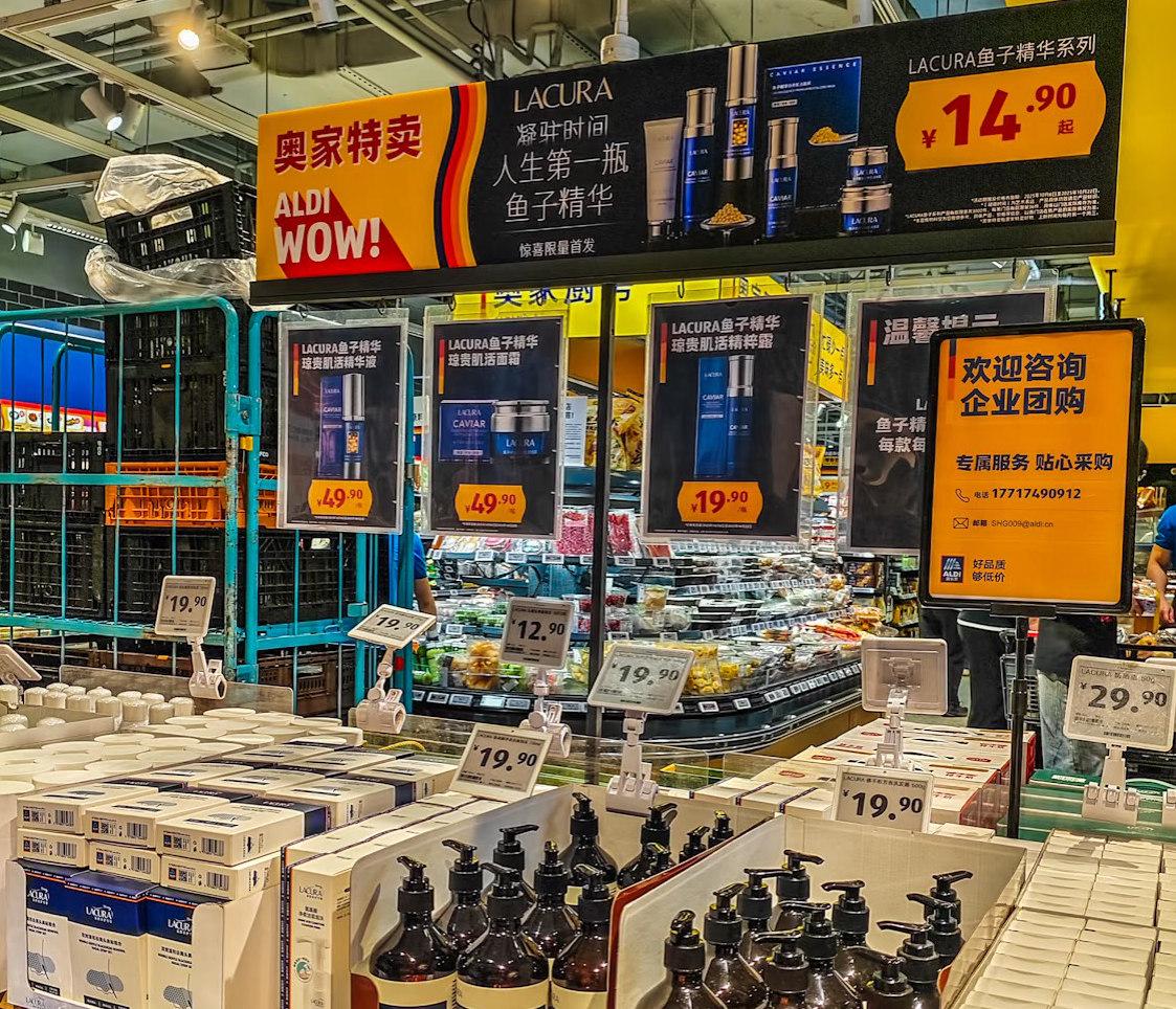 进一步看,具有特色的自有品牌,还是硬折扣超市构建差异化优势的根本。典型案例当属奥乐齐旗下自有美妆品牌Lacura,后者推出的乳木果护手霜、天竺葵沐浴露,分别定价9.9元、19.9元,凭借超高性价比,被消费者视为欧舒丹和Aesop平替,在网上被争相代购;最新推出的鱼子精华系列,更是在部分门店一度售罄,成为小红书上的热门话题。