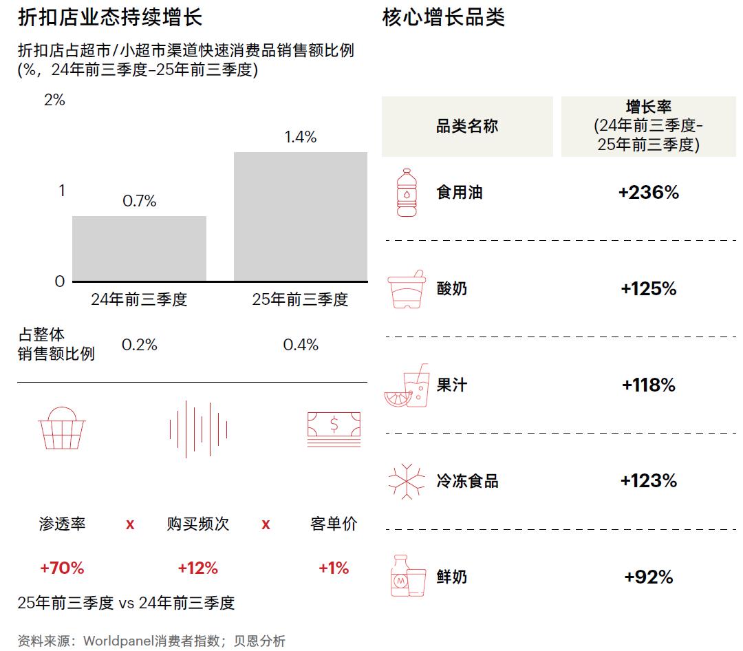 国内数据攀升强劲。调研机构贝恩公司发布的《2025中国购物者报告,系列二》显示,2025年前三季度,中国折扣店规模同比增长92%,在所有快消品线下渠道中增速最快,其中渠道渗透率同比增长70%,消费者购买频次同比增长12%。