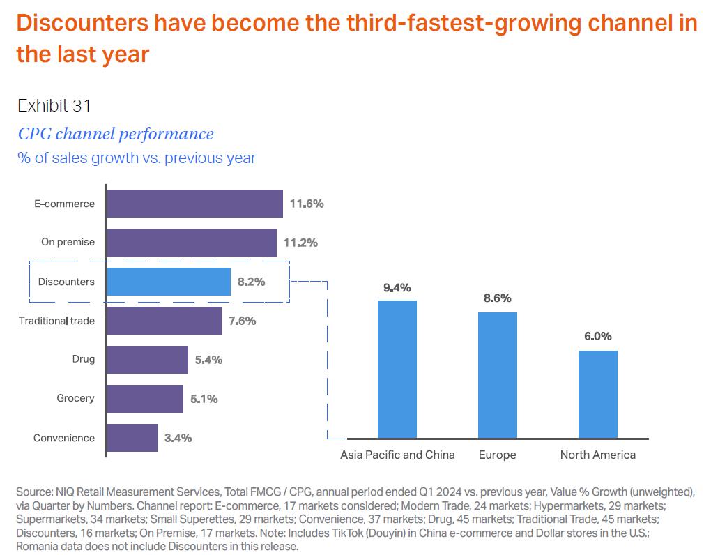 全球数据亦颇稳健。调研机构尼尔森IQ发布的《通往2025:全球消费者展望》显示,2024年全球折扣零售渠道同比增长8.2%,销售额增量61.1亿美元,增速位列零售业第三。