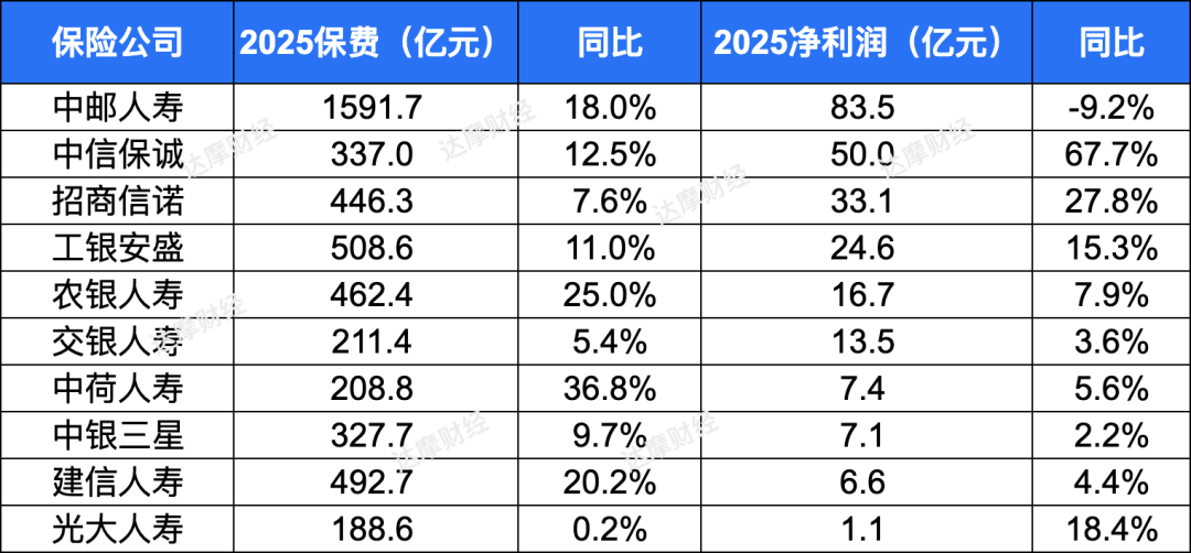 但规模增长的背后,是“增收不增利”的尴尬困境。2025年,中邮人寿实现净利润83.5亿元,同比下降9.2%,成为所有银行系寿险中唯一一家净利润同比下滑的机构,与行业整体盈利态势形成鲜明反差。