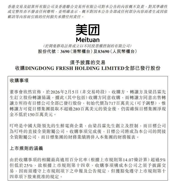 2026年2月5日,香港联交所的一纸公告,为持续数月的猜测画上了休止符,也引爆了中国互联网与零售圈。美团宣布将通过间接全资附属公司,以7.17亿美元(约合人民币49.76亿元)的初始对价,完成对叮咚买菜中国业务100%股权的收购。