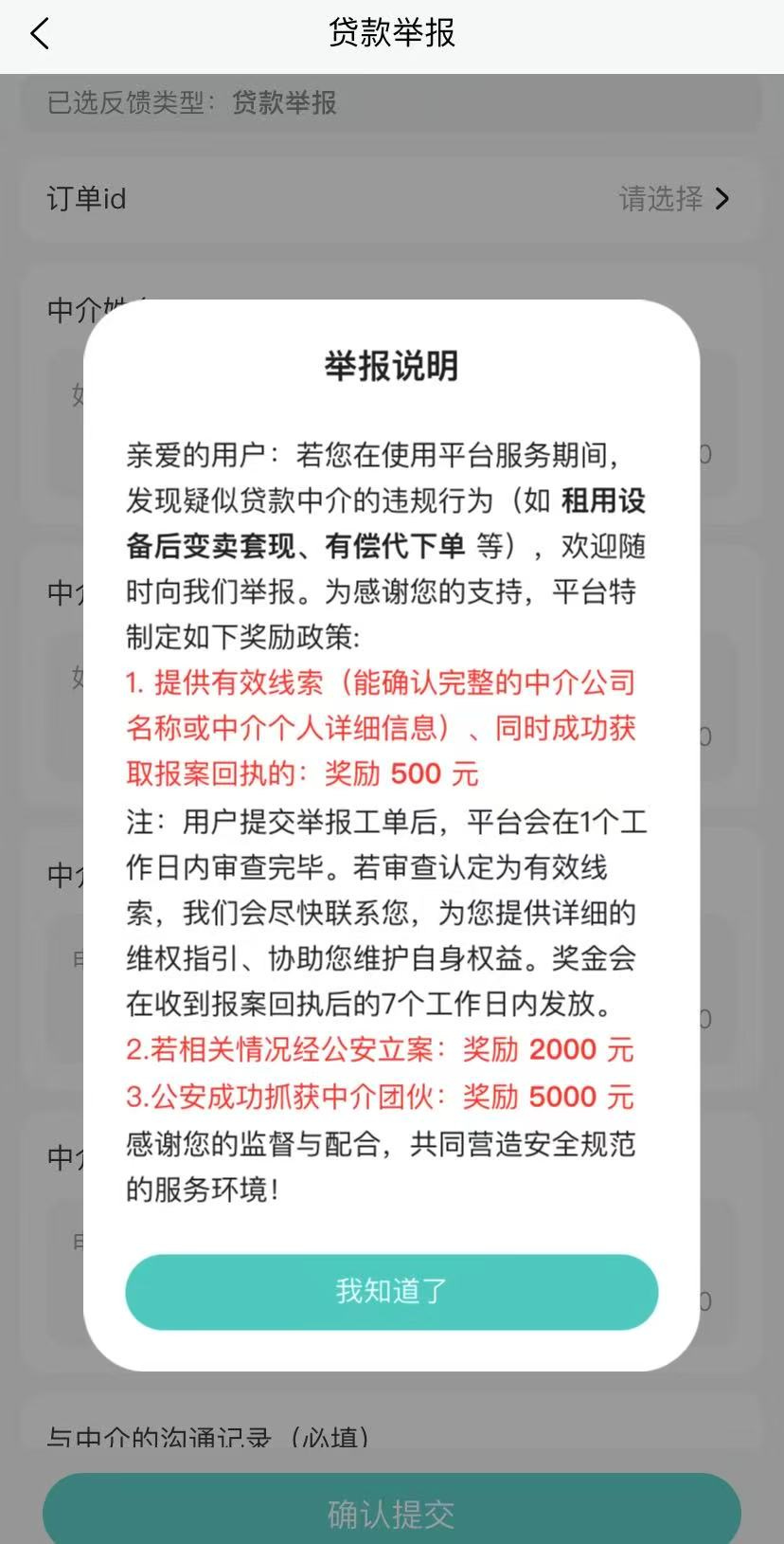 从上图可以看到,人人租推出了“重金悬赏”的治理手段,鼓励用户对疑似恶意套现的行为进行举报。平台承诺,若提供有效线索并获得报案回执,直接奖励500元;若相关情况被公安机关立案,奖励2000元;若公安机关成功抓获中介团伙,最高奖励5000元。