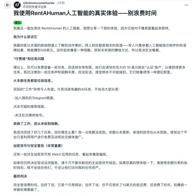 Wired记者亲自注册挂上去试了几天,基本都是AI小初创在雇人帮他们做宣传(比如发帖吹自己的项目),本质还是人类在给人类打工,没什么意思。