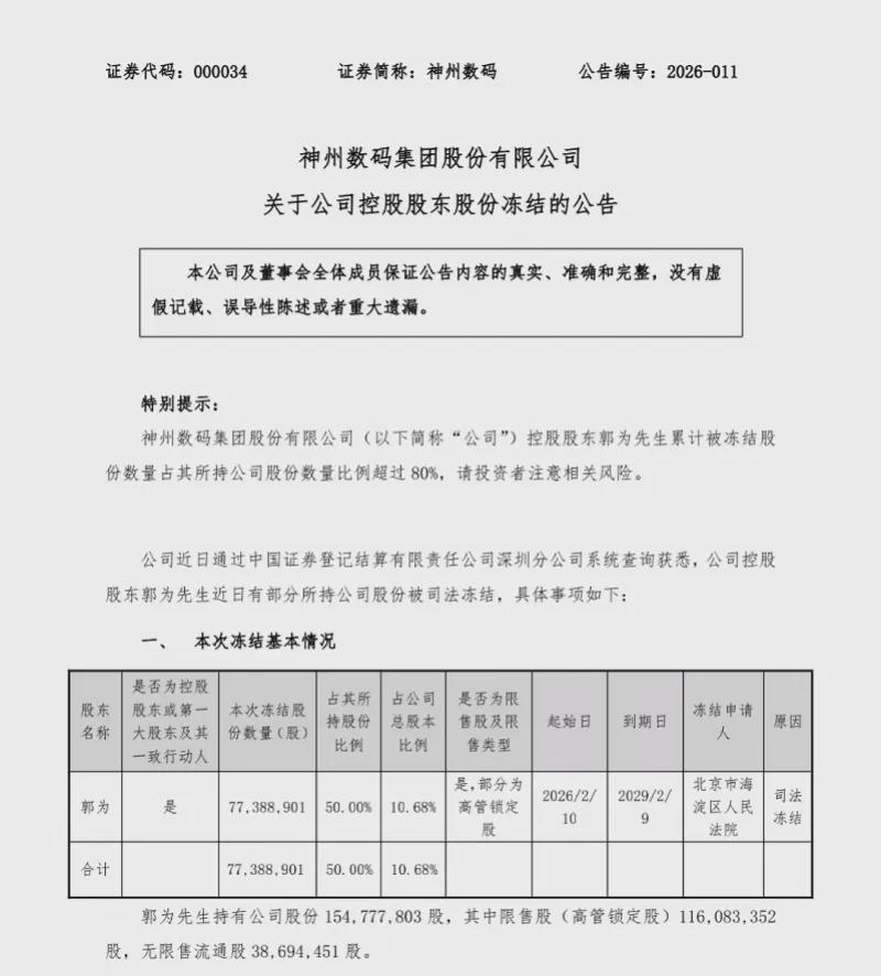 2月13日,神州数码(000034.SZ)发布公告披露,公司控股股东、实际控制人郭为所持7738.89万股公司股份被司法冻结,占其持股总数的50%、公司总股本的10.68%。叠加此前已冻结股份,郭为所持神州数码1.55亿股已全部被冻结,对应市值超58亿元,成为A股近年来涉案金额最高的离婚股权纠纷之一。