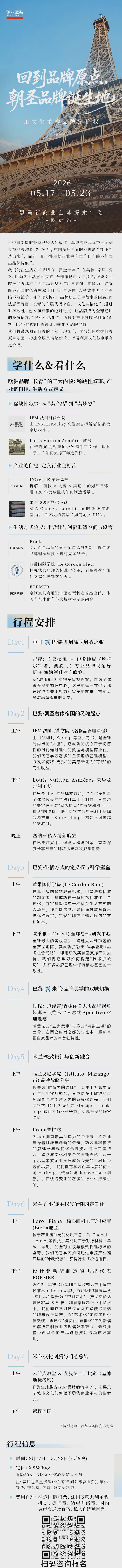 报名「黑马·欧洲游学」,7天6晚,我们将带您回到品牌的“第一现场”,从巴黎到米兰,直击LV、欧莱雅、Prada等顶流品牌的诞生地与核心工厂。