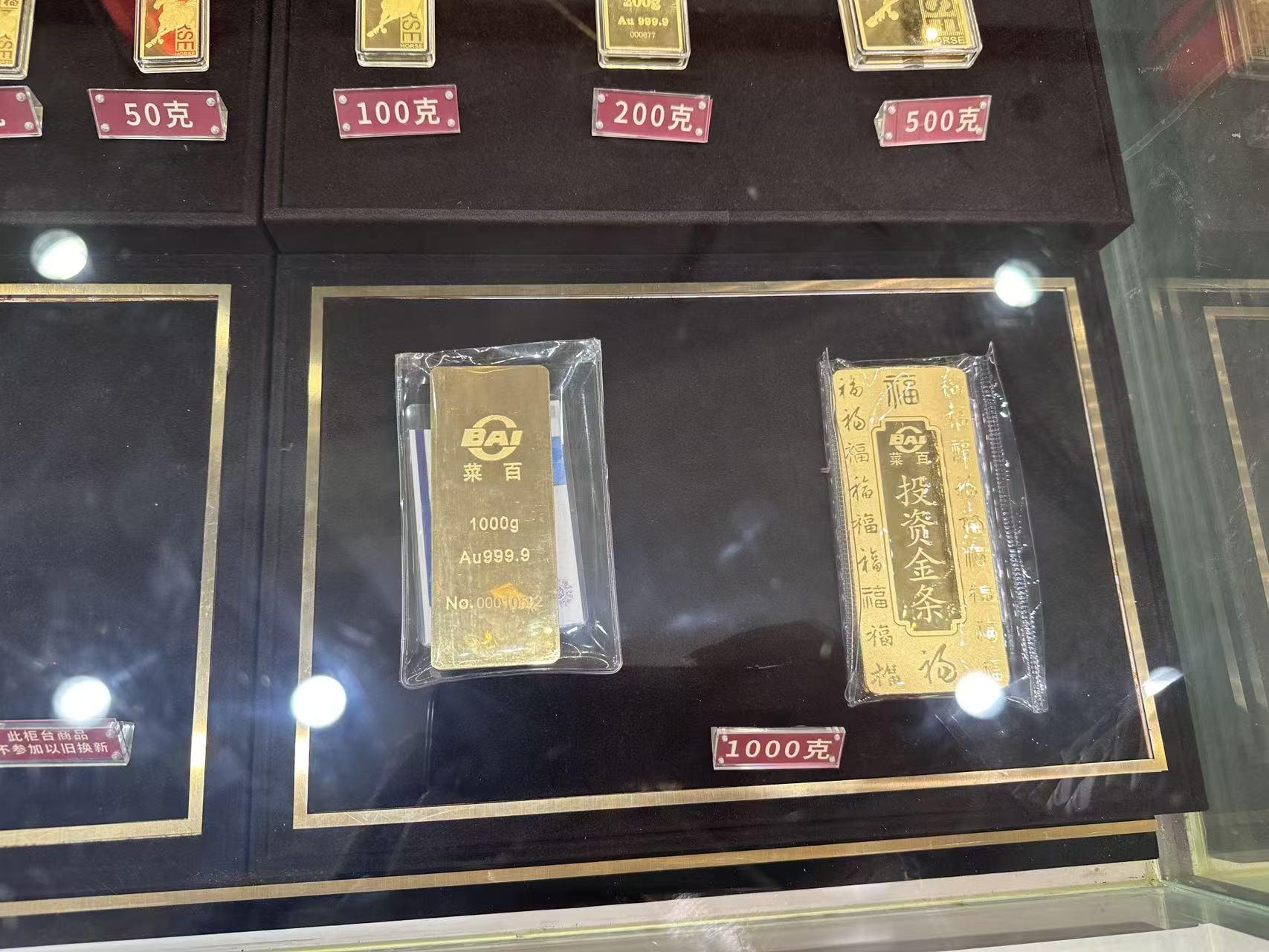 当被问及哪个克重的投资金条卖得更好时,该柜员透露:“1000克的投资金条买得多一些,这个是我们的新款,前两天都卖断货了。”时代周报记者注意到,当天菜百投资金条基础金价为1112元/克,按此计算,购买1000克投资金条需花费111.2万元。