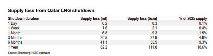 从供应损失的量级来看,汇丰测算如下:停产一个月损失约680万吨,三个月损失约2050万吨,六个月则高达约4110万吨,分别相当于2025年全球LNG年贸易量的1.5%、4.6%和9.3%。