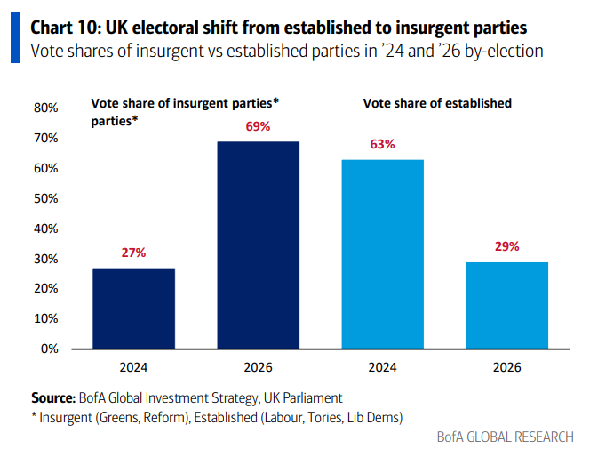 支撑通胀性繁荣的逻辑链清晰:政治民粹主义(英国选举中非建制党派票仓从2024年的27%跃升至2026年的69%)、关税与移民政策逆转全球化、财政过度扩张、美联储政策妥协、以及股市"大而不能倒"带来的资产与财富通胀。