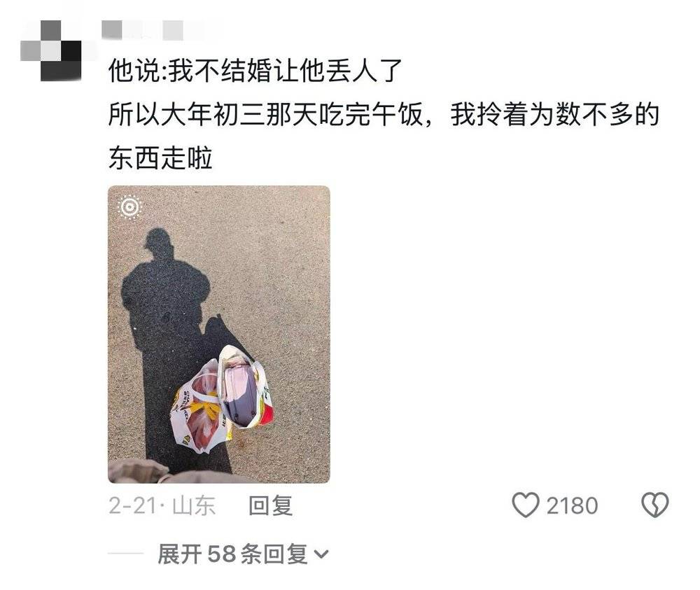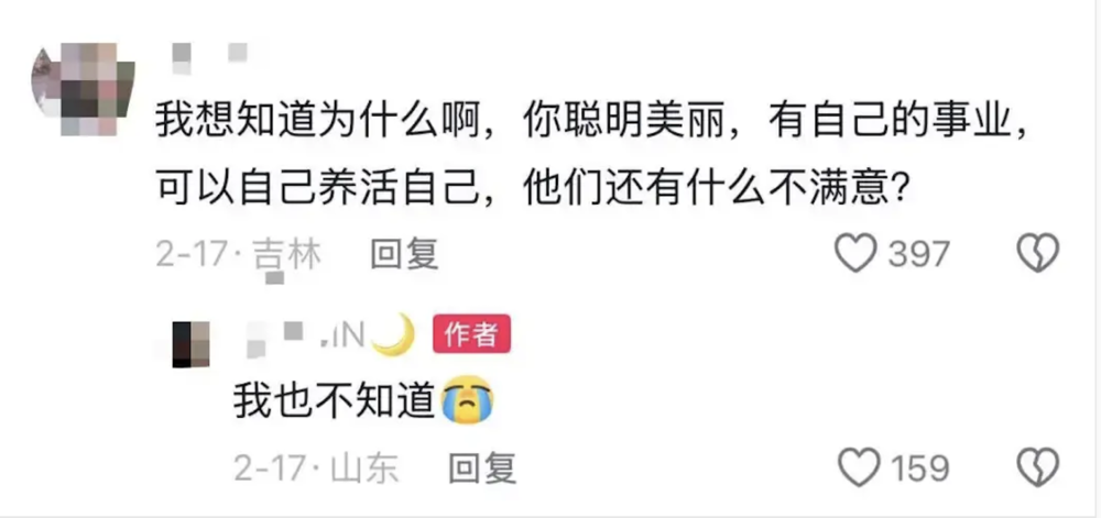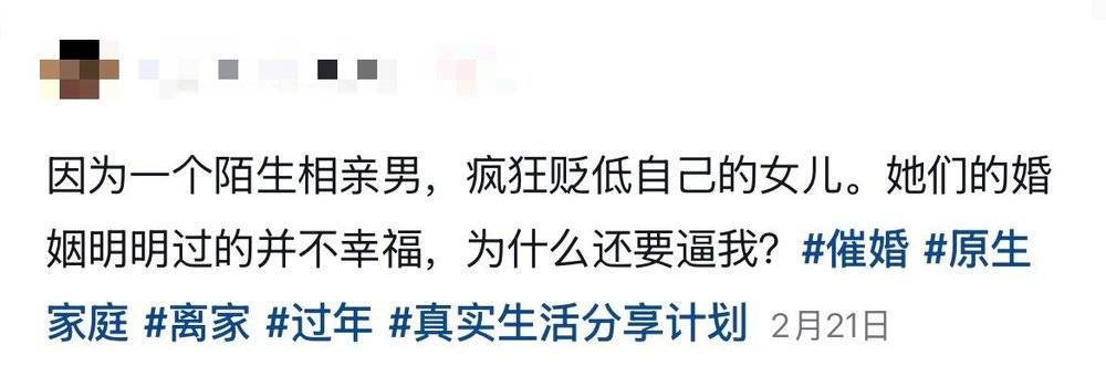 同样困境的年轻女性在她的评论区里互相取暖。她们几乎都没有度过一个平稳的新年,家庭矛盾大多是一致的:催婚,催生,催上岸,哭穷,阴阳怪气,指责埋怨。