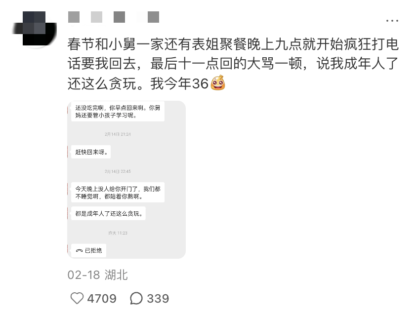 有人是36岁的成年人,还要被父母唠叨“晚上没有按门禁时间回家”;有人独自在外打拼多年,一回到家里还是要被批评“走路要挺胸收腹”;有人刚下地铁站,就被要求给父母60万首付,都多余出高铁站,不如直接原地买张票掉头就走。