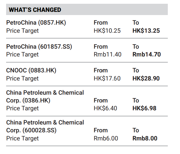 基于分部估值法(SOTP),大摩将中石油H股目标价上调29%至13.25港元,A股目标价上调29%至14.70人民币。