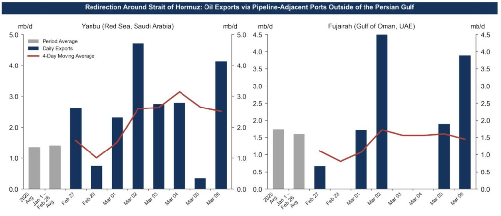 高盛估算,过去四天通过管道及亚布、富查伊拉港口实现的净改道量仅约为每日90万桶,远低于理论上每日360万桶的潜在改道能力。