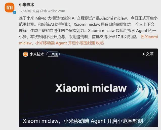 小米也不甘落后,发布了国内第一个手机版“龙虾”——Xiaomi miclaw,基于自家的MiMo大模型打造,目前已经开启小范围封测,首批支持小米17系列机型。