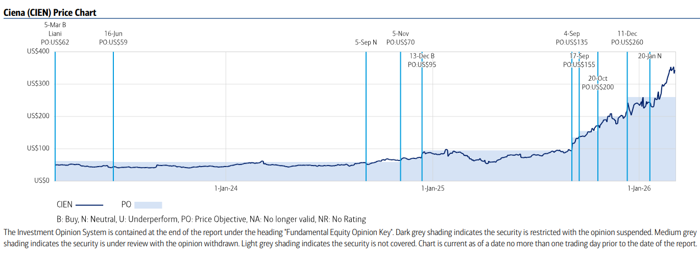 美银预计,Ciena有望在800G光模块市场继续扩大份额,其WaveLogic 6 Nano芯片采用3nm DSP工艺,在功耗方面具备明显优势。此外,Ciena还为Meta开发了DCOM数据中心管理系统,预计2026年将带来超过1亿美元收入。美银给予Ciena “买入”评级,目标价355美元。