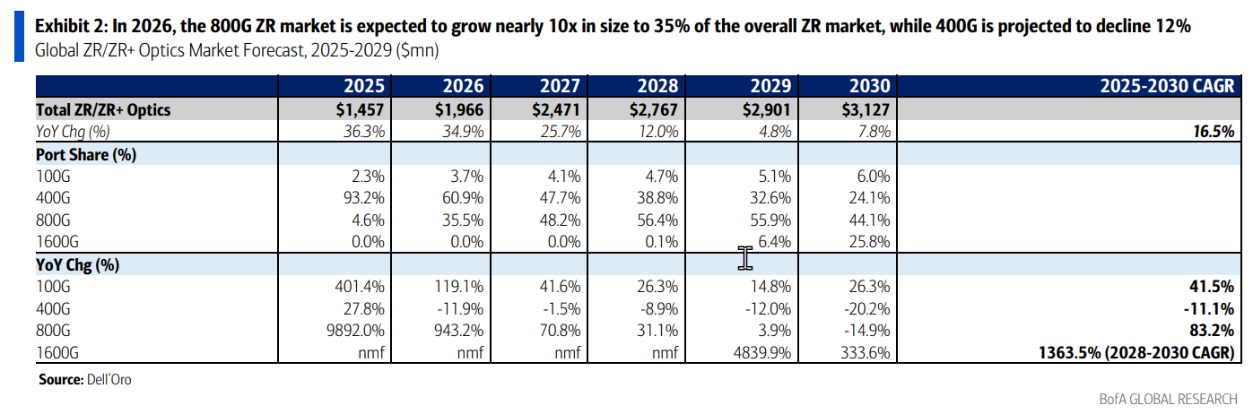 Dell’Oro数据显示,2025年400G ZR占市场93%,2026年占比将降至61%,800G占比将跃升至35%。