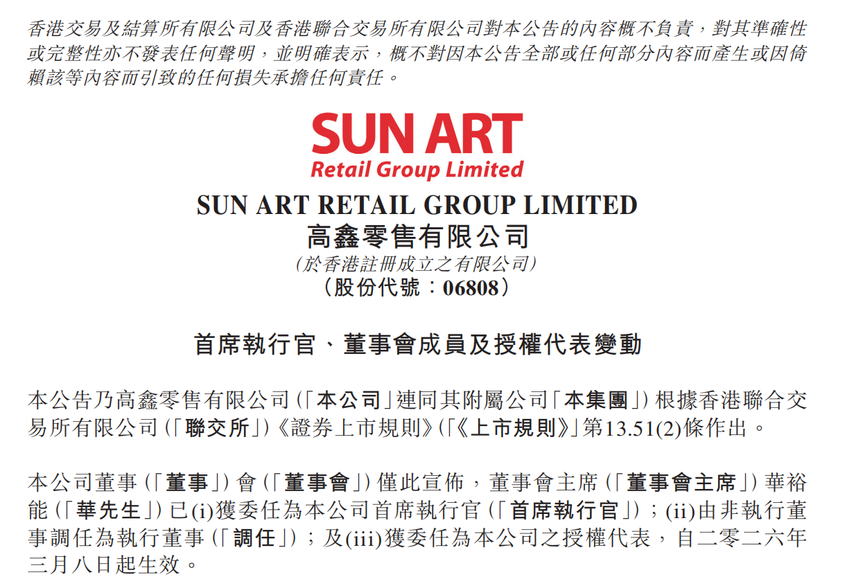 3月8日,大润发母公司高鑫零售发布首席执行官、董事会成员及授权代表变动公告,宣布董事会主席华裕能已获委任为公司首席执行官,前任CEO李卫平因长期失联已被免职。