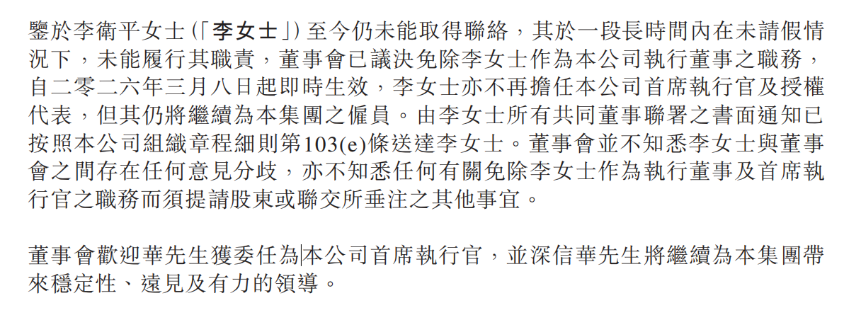 据公告介绍,鉴于李卫平女士至今仍未能取得联络,其于一段长时间内在未请假情况下,未能履行其职责,董事会已议决免除李女士作为公司执行董事之职务,自3月8日起即时生效,李女士亦不再担任公司CEO及授权代表,但其仍将继续为集团之雇员。公告还表示,董事会并不知悉李女士与董事会之间存在任何意见分歧,亦不知悉任何有关免除李女士作为执行董事及CEO之职务而须提请股东或联交所垂注之其他事宜。