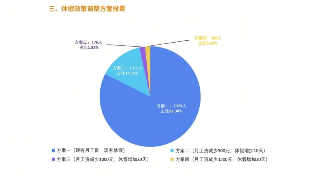 面对四个不同梯度的“降薪增假”方案,高达82.38%的员工投票选择了“方案一”,即维持现有的工资与休假制度不变。