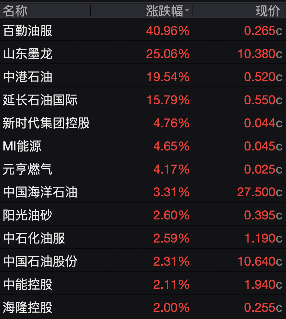石油石化股多数上涨,山东墨龙涨超25%,中国海洋石油涨逾3%,中石化油服、中国石油股份、中能控股涨逾2%。