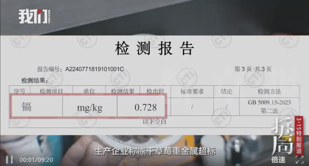 这意味着,这款冻干草莓的镉含量,足足超标了14倍还多。